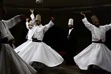 Sufi whirling (or Sufi turning) (Turkish: Semazen borrowed from Persian Sama-zan, Sama, meaning listening, from Arabic, and zan, meaning doer, from Persian) is a form of physically active meditation which originated among certain Sufi groups, and which is still practiced by the Sufi Dervishes of the Mevlevi order and other orders such as the Rifa'i-Marufi. It is a customary meditation practice performed within the sema, or worship ceremony, through which dervishes (also called semazens, from Persian سماعزن) aim to reach greater connection with Allah. This is sought through abandoning one's nafs, ego or personal desires, by listening to the music, focusing on God, and spinning one's body in repetitive circles, which has been seen as a symbolic imitation of planets in the Solar System orbiting the Sun.[1]