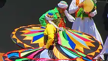 In Egypt, the practice of whirling has been adapted as tanoura (Arabic: التنورة el-tanoura). The word tanoura or tannoura refers to the colorful skirt worn by the whirler, with a color representing each Sufi order.[11] The word may also refer to the dancer, traditionally a Sufi man.[11] Tanoura is associated with Sufism and is performed at Sufi festivals, but it is also performed by non-Sufis as a folk dance or concert dance.