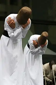 Among the Mevlevi order, the practice of dhikr is performed in a traditional dress: a tennure, a sleeveless white frock, the destegul, a long sleeved jacket, a belt, and a black overcoat or khirqa to be removed before the whirling begins.[6] As the ritual dance begins, the dervish dons a felt cap, a sikke, in addition to a turban wrapped around the head, a trademark of the Mevlevi order.[6] The sheikh leads the ritual with strict regulations. To begin,