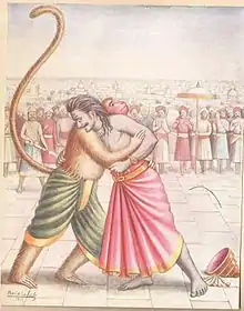Together, Sugriva and Rama went to seek out Vali. While Rama stood back, Sugriva shouted a challenge and dared him to battle. The brothers rushed at each other, fighting with trees and stones, with fists, nails, and teeth. They were evenly matched and indistinguishable to the observer, until Sugriva's counselor Hanuman, stepped forward and placed a garland of flowers around Sugriva's neck. It is then that Rama emerged with his bow and drove an arrow through Vali's heart.[6] After Vali's death, Sugriva reclaimed the vanara kingdom, took back his first wife, Ruma, and also reclaimed Vali's primary wife, Tara, who became his queen. Her son by Vali, Angada, became the crown prince.[7]