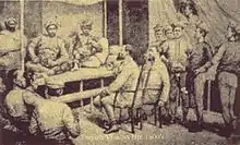 Datu Amil (sitting left), an influential leader of the Tausūgs in discussion with Captain W.O. Reed, US 6th Cavalry Regiment during the American Moro Campaigns. Amil was later killed by the Americans which marking the starting end of the sovereignty of the Sulu Sultanate when the Americans relinquished their powers until the end of the last battle with the Moros in which their region fell under the American rules.[73][74]