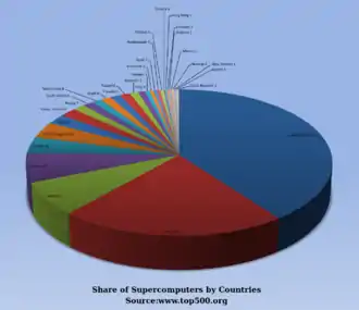 The US has long been the leader in the supercomputer field, first through Cray's almost uninterrupted dominance of the field, and later through a variety of technology companies. Japan made major strides in the field in the 1980s and 90s, with China becoming increasingly active in the field. As of May 2022, the fastest supercomputer on the TOP500 supercomputer list is Frontier, in the US, with a LINPACK benchmark score of 1.102 ExaFlop/s, followed by Fugaku.[11] The US has five of the top 10; China has two; Japan, Finland, and France have one each.[12] In June 2018, all combined supercomputers on the TOP500 list broke the 1 exaFLOPS mark.[13]