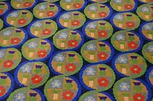 Another emblem is formed from a more abstract set of depictions of the four floral emblems and is used in the carpets of the Middlesex Guildhall designed by Sir Peter Blake, creator of such works as the cover of The Beatles' 1967 album, Sgt. Pepper's Lonely Hearts Club Band.[91]