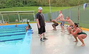 Just before plunging into the pool, swimmers may perform exercises such as squatting. Squatting helps in enhancing a swimmer's start by warming up the thigh muscles.[8]