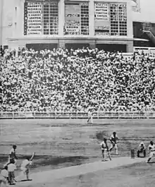 In 1896 the Ladies' Stand was opened, along with a concrete cycling track which circled the inside of the ground.[3] One of the carpenters who built the formwork for the track was George Bradman, father of Don Bradman. In 1898 floodlights were built over the cycling track so that night events could be held. In 1904 the scoreboard was rebuilt at the top of The Hill and in 1909 the Sheridan Stand, named after Phil Sheridan, was opened at the southern end, replacing the earlier Smokers' Stand.