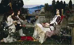 The symbolist style has frequently been confused with the Decadent movement, the name derived from French literary critics in the 1880s, suggesting the writers were self indulgent and obsessed with taboo subjects.[17] While a few writers embraced the term, most avoided it. Jean Moréas' manifesto was largely a response to this polemic. By the late 1880s, the terms "symbolism" and "decadence" were understood to be almost synonymous.[18] Though the aesthetics of the styles can be considered similar in some ways, the two remain distinct. The symbolists were those artists who emphasized dreams and ideals; the Decadents cultivated précieux, ornamented, or hermetic styles, and morbid subject matters.[19] The subject of the decadence of the Roman Empire was a frequent source of literary images and appears in the works of many poets of the period, regardless of which name they chose for their style, as in Verlaine's "Langueur":[20]