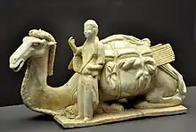 The most common animals, and the most likely to be large and carefully modelled and decorated, are horses and camels. Both sorts range from animals without harness and saddlery to those with elaborately detailed trappings, and carrying riders or, in the case of camels, heavy loads of goods. At least two famous camels carry a small human orchestra.[54] Dogs and farm animals, apart from some bulls at up to about 30 cm high, are more likely to be small and unglazed.[55]