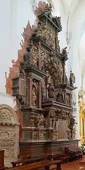 After the death of Jan Tarnowski (16 May 1561), Italian sculptor Jan Maria Padovano began creating one of the most beautiful examples of Renaissance headstones in the Polish–Lithuanian Commonwealth. The monument of hetman Tarnowski is almost 14 meters tall, and stands in St. Anne Chapel, which is located in northern nave of the Tarnów Cathedral. Padovano completed his work in 1573; furthermore, he designed the Renaissance town hall, and oversaw its remodelling in the 1560s. At that time, in 28 niches of the town hall were portraits of members of the Tarnowski family – from Spicymir Leliwita to Jan Krzysztof Tarnowski, who died in 1567. In 1570 Tarnów became property of the Ostrogski family, after Zofia Tarnowska, the daughter of the hetman, married prince Konstanty Wasyl Ostrogski. In 1588, after Konstanty's death, the town changed hands several times, belonging to different families, which slowed its development. Until the Partitions of Poland, Tarnów belonged to the County of Pilzno, Sandomierz Voivodeship. The town, like almost all locations of Lesser Poland, was devastated in October 1655, during the Swedish invasion of Poland, and as a result, its population declined from 2,000 to 768. In 1723, the town became the property of the Sanguszko family, which purchased it from the Lubomirski family.