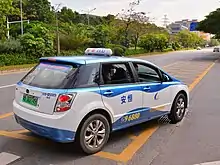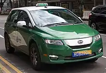 Taxicabs are very common throughout China. Different vehicles are used throughout China due to various provinces and cities' taxi company choices. Formerly, commonly used taxi cars were the Volkswagen Santana, Citroën Fukang and Citroën Elysée.[3] Following Shenzhen, many cities in China started using fleets of EV taxis,[4][5] using vehicles such as the BYD e6.[6]