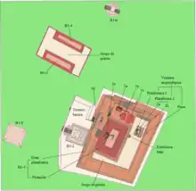 All the buildings in the Tazumal complex face west.[18] Tazumal is believed to possess a Mesoamerican ballcourt;[19] this is based upon the external appearance of two unexcavated mounds that are situated in the northwestern portion of the site, within a 20th-century cemetery. One of the mounds is badly damaged.[16] Green obsidian artefacts found at Tazumal indicate links with central Mexico.[20]
