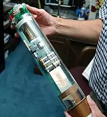 A telemeter is a physical device used in telemetry. It consists of a sensor, a transmission path, and a display, recording, or control device. Electronic devices are widely used in telemetry and can be wireless or hard-wired, analog or digital. Other technologies are also possible, such as mechanical, hydraulic and optical.[3]
