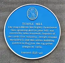 Temple Works, also known as Temple Mill, comprises an office building and a factory. The office building has a stone facade consisting of 18 full-height windows separated by 18 pillars with an overhanging cornice in the Egyptian style, based on the temple at Antaeopolis and the Temple of Horus at Edfu. The factory building derived from the Typhonium at Dendera. There was a chimney in the style of an obelisk, but after it developed a crack it was demolished and replaced by a brick structure in 1852. Hick's engine was modelled with Egyptian details, including a regulator designed by his son Benjamin in the form of a winged solar disk,[6][7] and replaced the original Watt engines.[1]