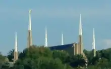 The Washington D.C. Temple (16), located in Kensington, Maryland, was the first temple built on the east coast of the United States. It was built with a modern six-spire design, with the three towers to the east representing the Melchizedek Priesthood leadership, and the three towers to the west representing the Aaronic Priesthood leadership. The central eastern tower reaches a height of 288 ft (88 m), the tallest of any LDS temple.