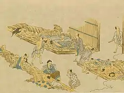The famine was further deepened by repeat insect infestations and outbreaks of disease.[4] Although the Tenpō famine is considered one of the Four Great Famines of the Tokugawa period, the Japanese demographer Akira Hayami has proposed that the deaths and population decline from the years of the famine were actually caused by the disease outbreaks rather than the famine itself.[5]