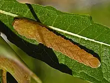 Tenthredo colon can reach a length of about 10–13 millimetres (0.39–0.51 in).[2] These sawflies have black head and thorax. Abdomen is black with a reddish area towards the tip. Legs are reddish. Antennae are black, with white tips.[3] The larvae are pale brown with a characteristic diamond pattern of diagonal cross lines and a darker brown mark on the head.[3]