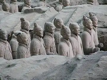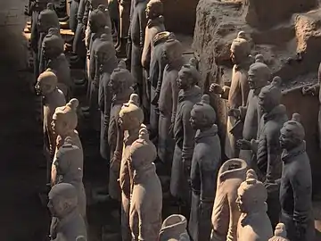 The terracotta army left some legacy however, as funeral terracotta armies are known from later dynasties, although in a less stern and militaristic style, and with much smaller statuettes, such as the Western Han Yangjiawan terracotta army (195 BCE) or Yangling terracotta army (141 BCE).[61] The human-sized monumental style of the Qin emperor was thus very short-lived, and would not reappear until the 4-6th centuries CE with the onset of monumental Buddhist sculpture in China.[62]