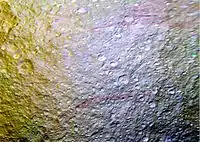 Cassini's observations allowed high-resolution maps of Tethys to be produced with the resolution of 0.29 km.[59] The spacecraft obtained spatially resolved near-infrared spectra of Tethys showing that its surface is made of water ice mixed with a dark material,[27] whereas the far-infrared observations constrained the bolometric bond albedo.[11] The radar observations at the wavelength of 2.2 cm showed that the ice regolith has a complex structure and is very porous.[26] The observations of plasma in the vicinity of Tethys demonstrated that it is a geologically dead body producing no new plasma in the Saturnian magnetosphere.[60]