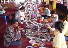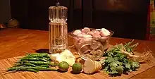 Thai meals typically consist of rice (khao in Thai) with many complementary dishes shared by all. The dishes are all served at the same time, including the soups, and it is also customary to provide more dishes than there are guests at a table. A Thai family meal would normally consist of rice with several dishes which should form a harmonious contrast of flavors and textures as well as preparation methods. Traditionally, a meal would have at least five elements: a dip or relish for raw or cooked vegetables (khrueang chim) is the most crucial component of any Thai meal.[23][24] Khrueang chim, considered a building block of Thai food by Chef McDang, may come in the form of a spicy chili sauce or relish called nam phrik (made of raw or cooked chilies and other ingredients, which are then mashed together), or a type of dip enriched with coconut milk called lon. The other elements would include a clear soup (perhaps a spicy tom yam or a mellow tom chuet), a curry or stew (essentially any dish identified with the kaeng prefix), a deep-fried dish, and a stir-fried dish of meat, fish, seafood, or vegetables.