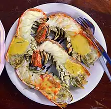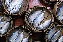 An ingredient found in many Thai dishes and used in every region of the country is nam pla, a clear fish sauce that is very aromatic. Fish sauce is a staple ingredient in Thai cuisine and imparts a unique character to Thai food. Fish sauce is prepared with fermented fish that is made into a fragrant condiment and provides a salty flavor. There are many varieties of fish sauce and many variations in the way it is prepared. Some fish may be fermented with shrimp or spices. Another type of sauce made from fermented fish is pla ra. It is more pungent than nam pla, and, in contrast to nam pla, which is a clear liquid, pla ra is opaque and often contains pieces of fish. To add this sauce to a som tam (spicy papaya salad) is a matter of choice. Kapi, Thai shrimp paste, is a combination of fermented ground shrimp and salt. It is used in the famous chili paste called nam phrik kapi, in rice dishes such as khao khluk kapi and it is indispensable for making Thai curry pastes. Tai pla is a pungent sauce used in the southern Thai cuisine, that is made from the fermented innards of the short mackerel (pla thu).[32] It is one of the main condiments of kaeng tai pla curry and is also used to make nam phrik tai pla.[33] Far removed from the nearest sea, from northern Thailand comes nam pu, a thick, black paste made by boiling mashed rice-paddy crabs for hours. It is used as an ingredient for certain northern Thai salads, curries, and chili pastes. It too has a strong and pungent flavor.[34]