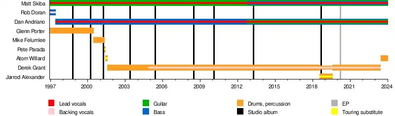 On June 8, 2023, Grant announced his departure from the band after 22 years, citing mental health reasons and a desire to pursue music production and graphic design.[37] On June 15, the band announced Atom Willard (who had previously served as a touring replacement in 2001) as their new permanent drummer.[38]