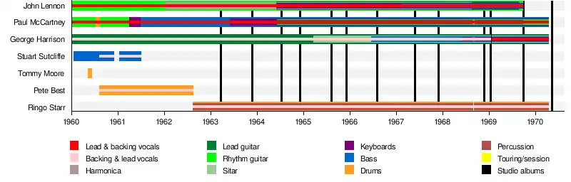 The Beatles were an English rock band formed in Liverpool in 1960, comprising John Lennon, Paul McCartney, George Harrison and Ringo Starr. They are regarded as the most influential band of all time[1] and were integral to the development of 1960s counterculture and the recognition of popular music as an art form.[2] Rooted in skiffle, beat, and 1950s rock 'n' roll, their sound incorporated elements of classical music and traditional pop in innovative ways. The band also explored music styles ranging from folk and Indian music to psychedelia and hard rock. As pioneers in recording, songwriting and artistic presentation, the Beatles revolutionised many aspects of the music industry and were often publicised as leaders of the era's youth and sociocultural movements.[3]