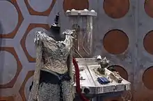 Idris' costume, and the makeshift TARDIS set, on display at the Doctor Who Experience.
