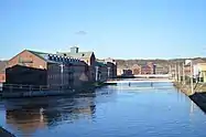 The Flats is a neighborhood in Holyoke, Massachusetts located to the east of the city center, adjacent to the downtown. Although it lies at one of the lowest elevations in Holyoke, its name derives not from topography but from the brick tenement "flats" which characterized its architecture throughout much of its history. Historically the area has also been associated with the name Depot Hill,[2] as it was the location of the city's first freight and passenger railway stations; passenger service was restored at Holyoke station in 2015, following a period of absence after 1967.[3] A section of the neighborhood between Lyman and Appleton Street to north and south respectively, and between Race and Bowers Street to the east and west is also known as Depot Square.[4][5] Today the area features the Holyoke Innovation District, Canal System, Hadley Falls Company Housing District, Marcella Kelly Elementary School, local Amtrak station and 275 acres (111 ha) of residential, commercial, and industrial zoning.