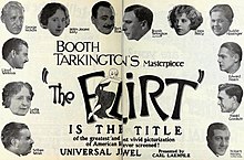 The Flirt is a 1922 American silent comedy film directed by Hobart Henley.[1] The cast included George Nichols, Lloyd Whitlock, Lydia Knott, William Welsh, Helen Jerome Eddy, Bert Roach, Eileen Percy, Edward Hearn, Harold Goodwin, and Buddy Messinger. It was based on Tarkington's 1913 novel The Flirt. It was a Carl Laemmle film produced by Universal Film Manufacturing Company. The story features a girl who insist on having things her way.[2] A film edition of the book was published in 1922 with film stills. Sheet music for a theme song, "The Flirt; Whose Heart Are You Breaking To-Night" was also released in 1922.[3]