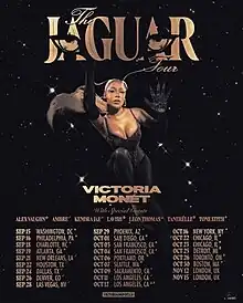 The Jaguar Tour was the debut concert tour by American singer-songwriter Victoria Monét in support of her debut studio album Jaguar II[1] and her fifth EP Jaguar. The tour was scheduled to commence on September 6, 2023, in Detroit, but due to venue changes, it commenced on September 15 at Washington, D.C. and concluded on November 18, 2023, in Salvador. Alex Vaughn, Ambré, Kendra Jae, Lavish, Leon Thomas, Tanerélle and Tone Stith will be supporting acts for select North American dates.[2][3]