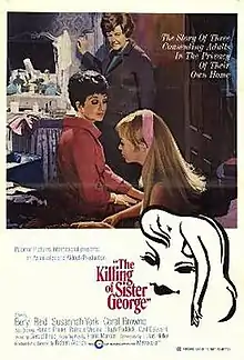 The Killing of Sister George is a 1968 American film directed by Robert Aldrich and filmed at his Aldrich Studios in Los Angeles. It is based on the 1964 play by British playwright Frank Marcus. In the film, an ageing lesbian television actress, June "George" Buckridge (Beryl Reid, reprising her role from the stage play), simultaneously faces the loss of her popular television role and the breakdown of her long-term relationship with a younger woman (Susannah York). Although Marcus's play was a black comedy,[4] the film version was marketed as a "shocking drama";[5] it added explicit lesbian content that was not in the original play,[6] and was presented as a serious treatment of lesbianism.[7]