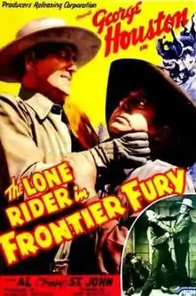 The Lone Rider in Frontier Fury is a 1941 American Western film directed by Sam Newfield. The film stars George Houston as the "Lone Rider" and Al St. John as his sidekick "Fuzzy" Jones, with Hillary Brooke, Karl Hackett, Ted Adams and Arch Hall Sr. The film was released on August 8, 1941, by Producers Releasing Corporation.[1][2][3] The film is also known as Frontier Fury in the United Kingdom and Rangeland Racket (American reissue title).