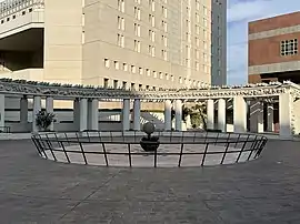 The work is installed in a central plaza in three parts. One fountain has a reclining bronze child and a bronze globe. A niche in a pillar has an abstract metal female figure on a chair. Her ankle is chained to the wall. An overhead cast concrete frieze runs along a pergola and down its columns. The frieze has abstract human figures carrying balls, boxes, and pillars.[3] A human figure in the center of the frieze has multiple arms and holds a knife in one hand and a decapitated human head in another. A nearby human figure clings to the underside of a rhinoceros, and another depicts a human figure with an elephant.[3]
