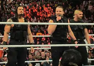 The Shield[7] was a professional wrestling stable in WWE that consisted of Dean Ambrose, Roman Reigns, and Seth Rollins. Their original characters were mercenaries for CM Punk; however, they quickly became mainstay main-event names.[8] The group debuted on November 18, 2012 at the Survivor Series pay-per-view.[5] The Shield was a dominant force in six-man tag team matches with an undefeated televised streak lasting from December 2012 to May 2013, during which they scored a victory at WrestleMania 29.[9] In May 2013 at Extreme Rules, all three members of The Shield won a championship, with Ambrose winning the United States Championship while Rollins and Reigns captured the WWE Tag Team Championship.[10] Rollins and Reigns were WWE Tag Team Champions until October 2013, and Ambrose was United States Champion until May 2014, which was a record reign for the WWE version of the championship.[11][12] As a Shield member, Reigns gained prominence by setting and equaling elimination records at the 2013 Survivor Series and the 2014 Royal Rumble events.[13][14]
