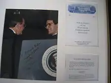 U.S. President George H. W. Bush congratulates Richard Behar upon his receiving the Worth Bingham Prize for writing the Time article (1992).