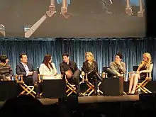The cast and crew of The Walking Dead at PaleyFest in 2011; (left to right): executive producer Gale Anne Hurd, Andrew Lincoln (Rick Grimes), Sarah Wayne Callies (Lori Grimes), Jon Bernthal (Shane Walsh), Laurie Holden (Andrea), Steven Yeun (Glenn Rhee), and Emma Bell (Amy)