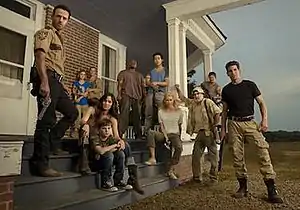 The primary characters of the second season include (from left to right): Rick, Sophia, Carol, Lori, Carl, T-Dog, Glenn, Andrea, Dale, Daryl, and Shane