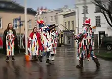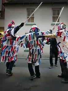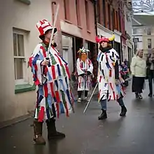 - 'dressed in white calico suits, three-cornered hats, and wooden swords. Their hats and clothes were decorated with gaily coloured paper ribbons.' [Douglas, 1950][46]
