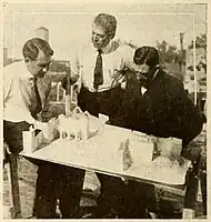 The entire production was filmed in Fort Lee at Fox's facilities located near the intersection of Main Street and Linwood Avenue.[14] Rather than going on location, traveling from New Jersey to Mexico with a large company of actors, crew, and other support personnel, Powell in the early months of 1915 had decided to send his scenic designer, J. Alan Turner, to Mexico to locate, photograph, and sketch the architecture, attire, and daily activities in a "typical village" there. Then, on his return to Fort Lee, Turner supervised the construction on Fox studio's backlot a 10-acre set with full-size replicas of the Mexican buildings he had documented in San José in Sonora.[15] The trade journal Motion Picture News regularly updated its readers on the production's development, noting that Powell spent more than $10,000 ($289,000 today) on the Mexican set. "The village", it reported, "is the result of the joint efforts of Mr. Powell himself, J. Alan Turner, who is known as a builder of expositions, and William Bach, the technical director of the Fox studios".[16]