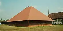 The temple has a pyramidal roof, with high walls, and a high-ceilinged interior. Within the large temple has a stage inside which is a large platform with its own pyramid roof. The stage area is separate from the audience area with the musician (a drummer on a high seat) behind the stage, and dressing rooms also at the rear with exit doors behind. The audience would be seated on a smooth, polished floor. Several Koothambalams exist within several Indian temples, and follow the same rectangular plan and structure.