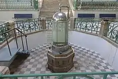 The interior is plastered and painted blue, encircled granite base and sections defined by pilasters where iron structures that support that roof are affixed, lined with wooden lathes painted in blue.[1] The main doorways are in the east, north and west preceded by three ample stairs with iron guardrail and ceramic flooring. In the centre of the building is the primitive buvette thermal spring recessed into an octagonal plan with similar pavement, and protected by iron grate, painted green (with faceted basins on angles).[1] The fountain is protected by a cylindrical bell-shaped structure. Around the building is a raised wing, accessed by an intermediary landing of stairs, with black and white ceramic floors and iron guard painted green, decorated by stylized voluptuous motifs.[1] These structures also integrate lamps on their angles into the high columns, with globe of lighting surrounded by several stylized arms (the globe lighting repeated from the ceiling).[1] A gutter runs along the lowest part of the interior with drains in the corners.[1] A centralized apparatus opens the six central rotary panels; by using a vertical iron rod, moved by a lever, allows the windows to be opened simultaneously.[1] The rooftop is a grid of horizontal rods with bearings that run north to south supporting the weight of the structure.[1]