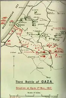 Meanwhile, preparations for the main attacks on the Gaza line at Hareira and Sharia, began on 1 November when the 53rd (Welsh) Division, with the Imperial Camel Brigade on the right, advanced northwards to occupy a line 3 miles (4.8 km) to the west without opposition. This placed the infantry in a position from which they could cover the right flank of the proposed attack by the XX Corps on Hareira and Sheria.[6][16]