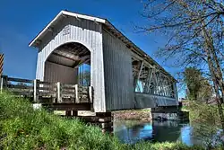At roughly 5 miles (8 km) upstream of the creek mouth, Gilkey Bridge and a covered railroad bridge next to it crossed the creek at the former community of Gilkey and its Gilkey Station along the tracks of the Southern Pacific Railroad.[18] The road bridge, a 120-foot (37 m) structure of the Howe truss type, was built in 1939, damaged and closed in 1997, repaired and re-opened in 1998.[18] The companion railroad bridge, a 125-foot (38 m) Howe truss span, was removed in 1962.[13] The Gilkey Covered Bridge carries Goar Road over the creek.[7]