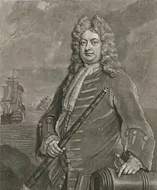 Thomas Hardy was born on Jersey on 13 September 1666.[Note 1] He was the son of John le Hardy, Solicitor-General of Jersey, whose father in turn had held the same position.[2] Coming from a naval-minded family, Hardy's first cousin was the future Vice-Admiral Sir Charles Hardy.[3] Hardy himself joined the Royal Navy sometime before 1688, at which time he was serving as a captain's clerk to Captain George Churchill, who would go on to support Hardy in his rise through the service.[1][3] By 1692 Hardy had been promoted to lieutenant, and was serving as the first lieutenant of Churchill's 96-gun ship of the line[Note 2] HMS St Andrew. With the Nine Years' War ongoing, he fought at the Battle of Barfleur, between 19 and 24 May.[3][6]