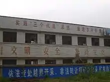 ![]() A slogan in Futu, Hubei, which reads: "Practice the Thought of Three Represents, advance the reform on rural tax system", with the word "reform" (改革) blocked by a billboard. | |||||||
