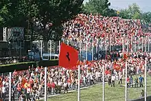 The tifosi provide Formula One with a sea of red filling the grandstands at the Italian Grand Prix. One of the most common tifosi sights is the display of an enormous Ferrari flag in the grandstands during Formula One weekends at every race circuit, with especially large contingents showing up in Ferrari livery at home and nearby European tracks. A similar sight could be observed in former years during the San Marino race, which was held at the Autodromo Enzo e Dino Ferrari near the town of Imola, 80 km (49.7 mi) east of the Ferrari factory in Maranello.