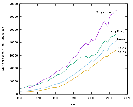 GDP per capita for the Four "Asian Tigers" (Singapore, Hong Kong, Taiwan and Korea) between 1960 and 2014
