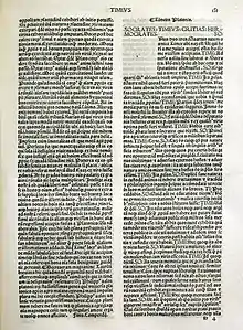 Participants in the dialogue include Socrates, Timaeus, Hermocrates, and Critias. Some scholars believe that it is not the Critias of the Thirty Tyrants who appears in this dialogue, but his grandfather, who is also named Critias.[1][2][3] It has been suggested from some traditions (Diogenes Laertius (VIII 85) from Hermippus of Smyrna (3rd century BC) and Timon of Phlius (c. 320 – c. 235 BC) that Timaeus was influenced by a book about Pythagoras, written by Philolaus, although this assertion is generally considered false.[4]