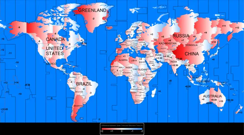 China extends as far west as 73°E, but all parts of it use UTC+08:00 (120°E), so solar "noon" can occur as late as 15:00 in western portions of China such as Xinjiang.[41] The Afghanistan-China border marks the greatest terrestrial time zone difference on Earth, with a 3.5 hour difference between Afghanistan's UTC+4:30 and China's UTC+08:00.