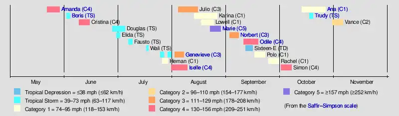 Tropical Storm Trudy (2014)Hurricane Ana (2014)Hurricane OdileHurricane Norbert (2014)Hurricane Marie (2014)Hurricane Iselle (2014)Hurricane Genevieve (2014)Tropical Storm Boris (2014)Hurricane AmandaSaffir–Simpson scale