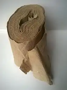 It is commonly supplied as a long strip of perforated paper wrapped around a paperboard core for storage in a dispenser near a toilet. The bundle, or roll of toilet paper, is known as a toilet roll,[3] or loo roll[4] or bog roll[5] in Britain.